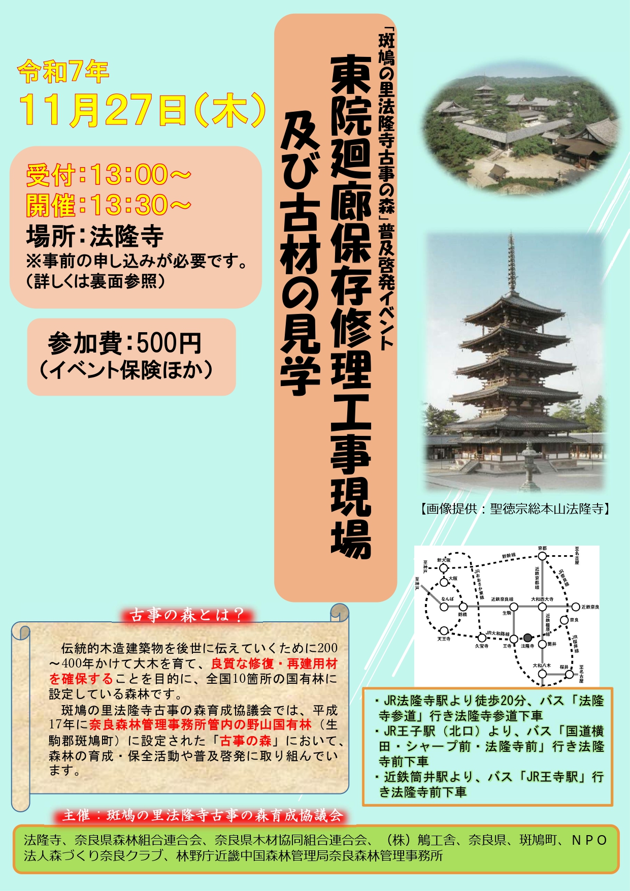◆ 開催日時 令和7年11月27日(木) 13:30~16:00 ◆ 会場 法隆寺 奈良県生駒郡斑鳩町法隆寺山内1-1 ◆ 参加費 500円(イベント保険ほか) ◆ 募集人数 …