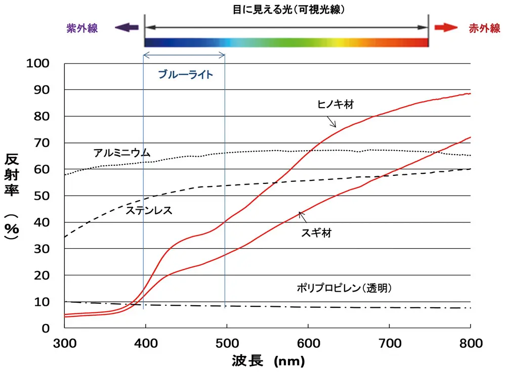 結果:奈良のスギ材、ヒノキ材いずれも、白内障や加齢黄斑変性の原因とされる紫外線をほとんど完全に除去。目の疲れや睡眠障害を引き起こすブルーライトを軽減