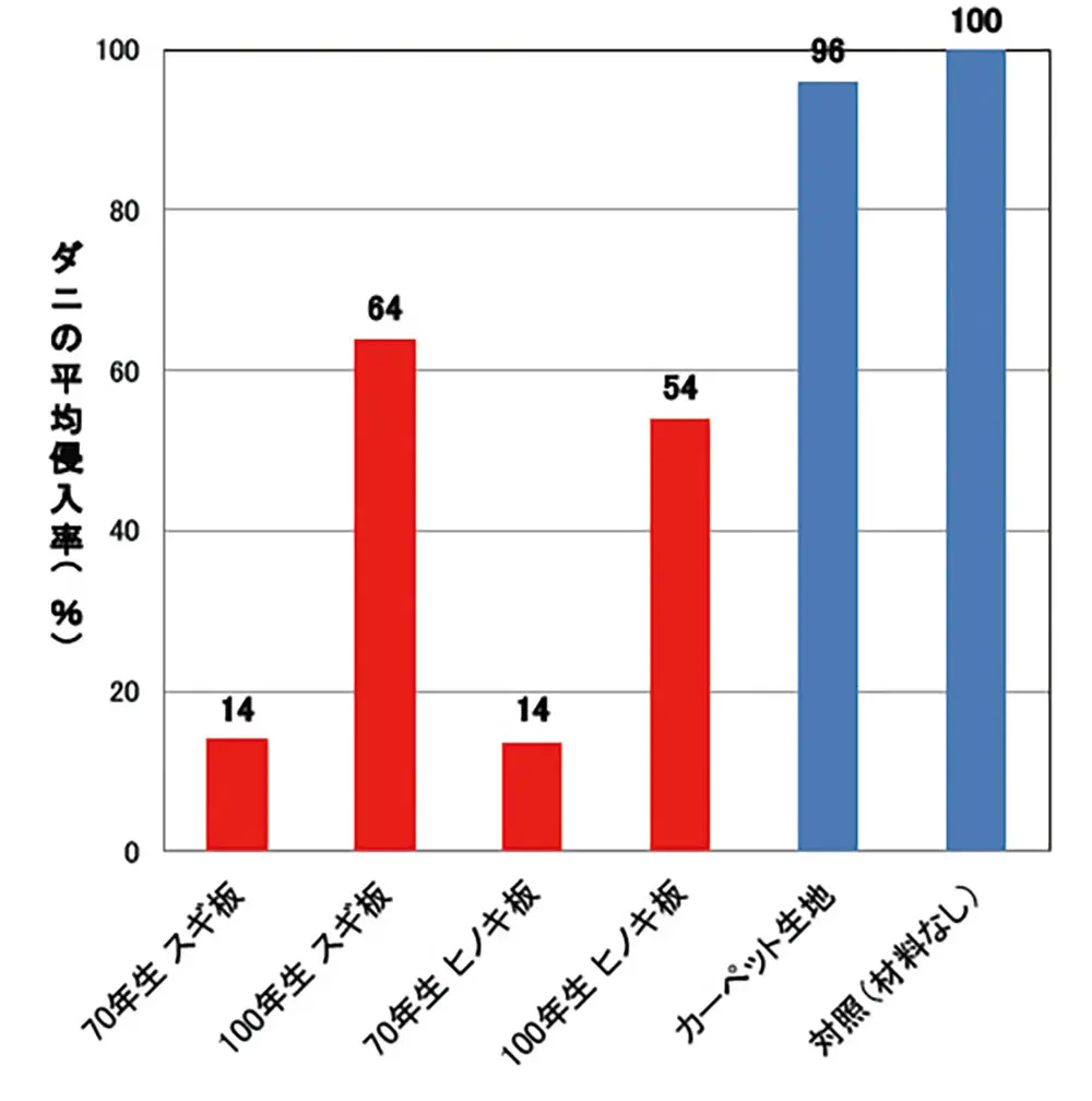 結果:奈良県のスギ材やヒノキ材に侵入したダニはカーペットの1/6~2/3。